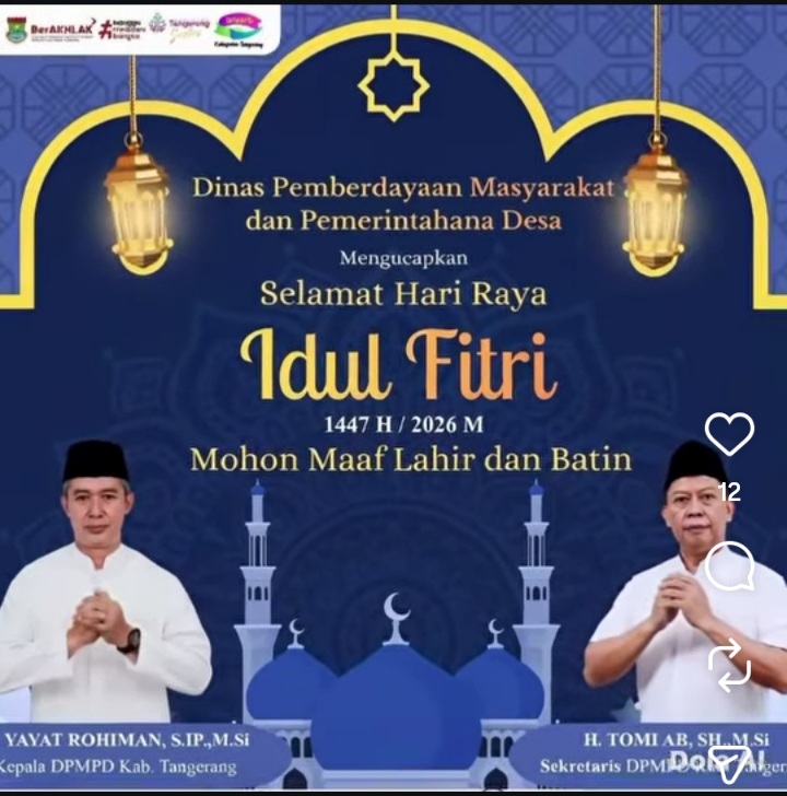 Dinas Pemberdayaan Masyarakat Dan Pemerintahan Desa Kabupaten Tangerang Mengucapkan admin infodesakitaMaret 22, 2026Maret 22, 202660 Dilihat Post Views: 60 Pos terkaitMalam Takbiran di Kelapa Dua Berlangsung Kondusif, Intan Nurul Hikmah Apresiasi MasyarakatBupati Tangerang Ajak Masyarakat Perkuat Silaturahmi dan Tingkatkan KepedulianMonitoring Malam Takbiran, Bupati Tangerang Pastikan Situasi Aman dan KondusifIke Megasari Dewan Pembina Yayasan Insan Pantura Gemilang MengucapkanKepala Desa Belimbing Kecamatan Kosambi Dan Staf MengucapkanKetua DPD HMNI Dan Pengurus Kabupaten Tangerang Mengucapkan
